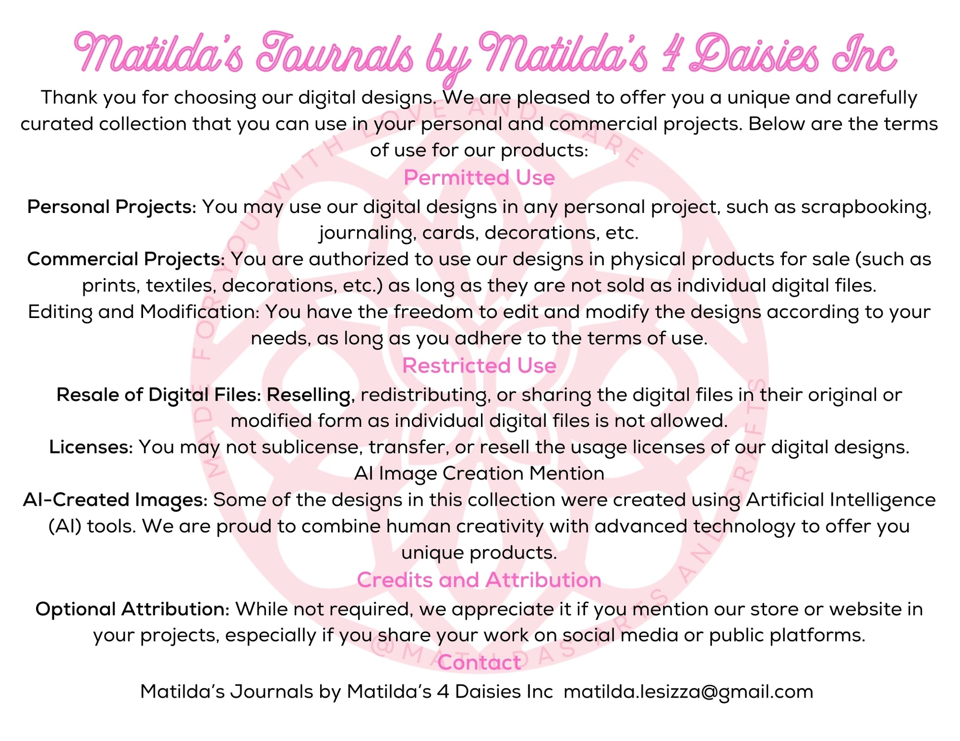 Available Items for purchase separately: Journal focal pages, complementary pages, and textures, lined pages in JPG format, in both Letter and A4 sizes. But that's not all! Also includes templates for envelopes, cards and tags, various decorations, bookmarks, half-page designs, quarter-page designs, 8x8 inch pages, 6x6 inch designs, ATC Cards, ephemera, and much more! The possibilities are endless!