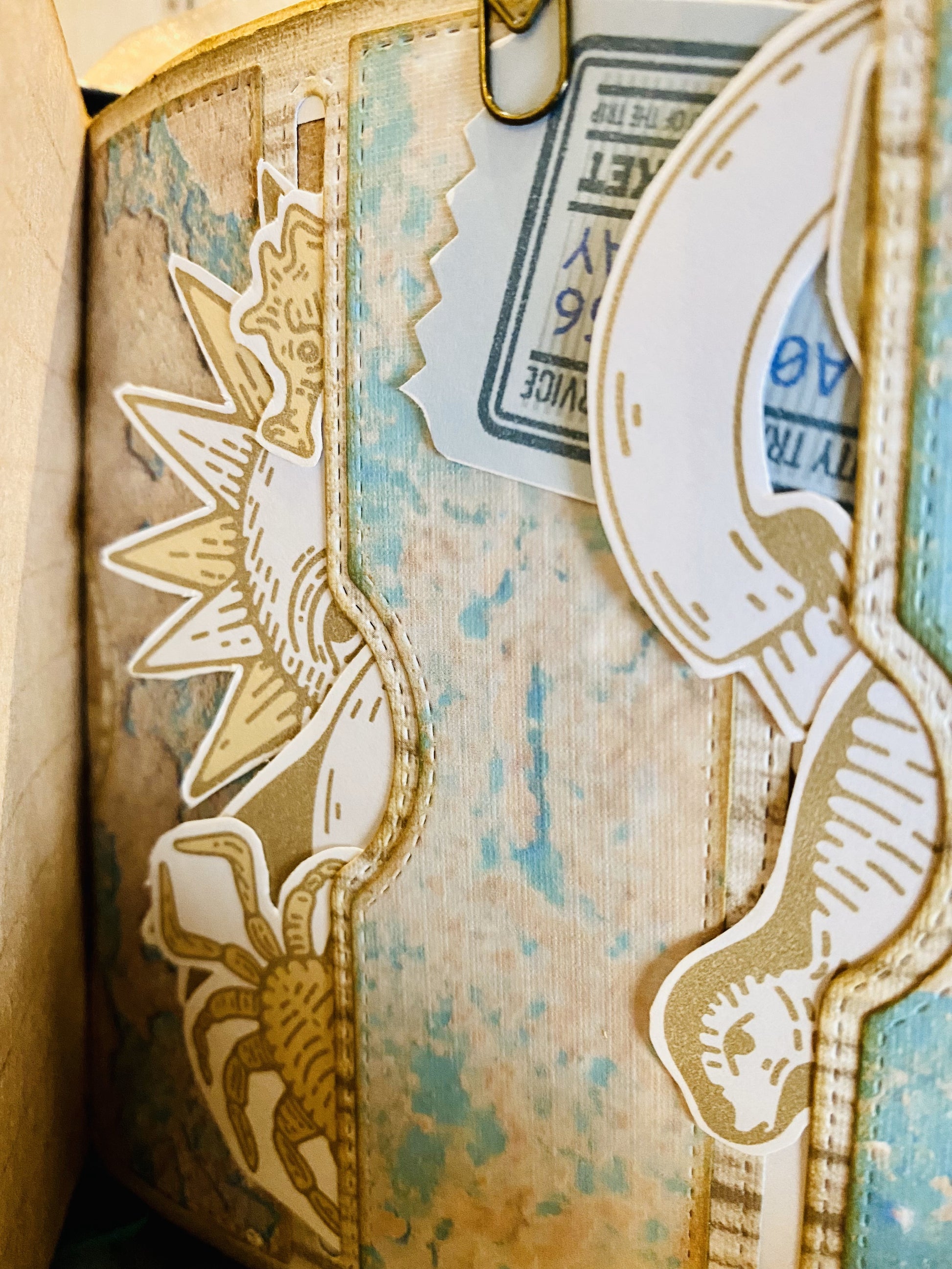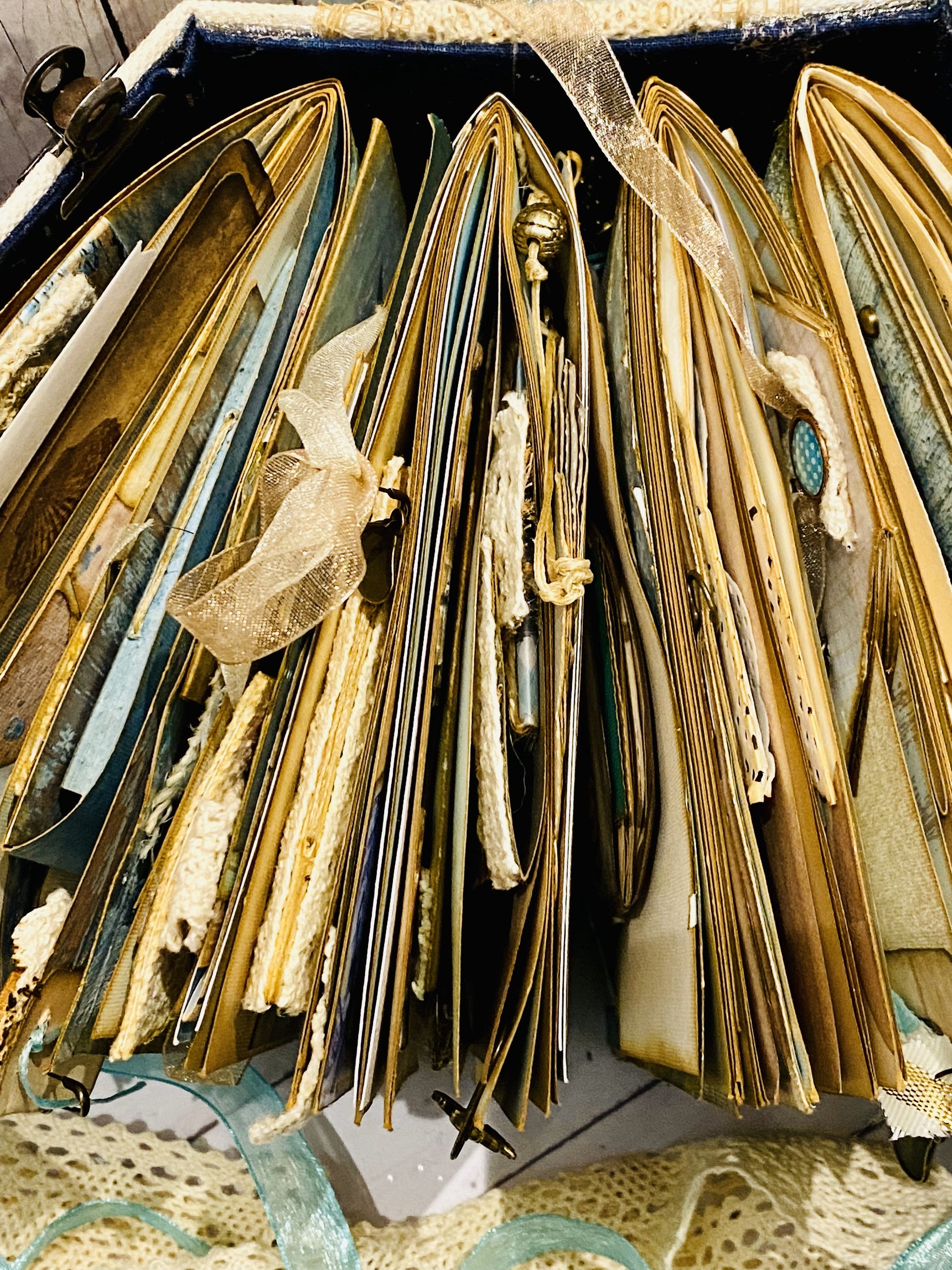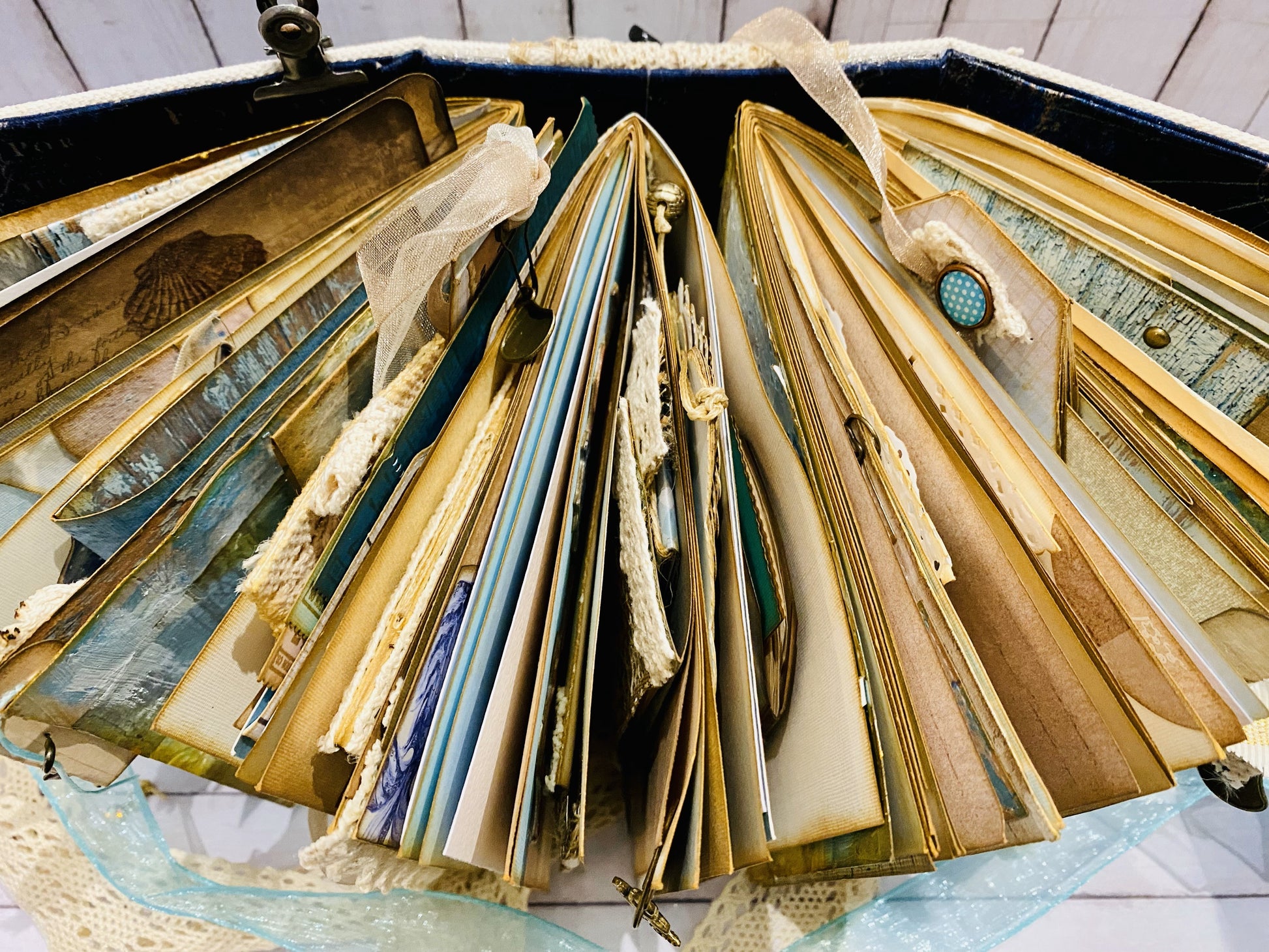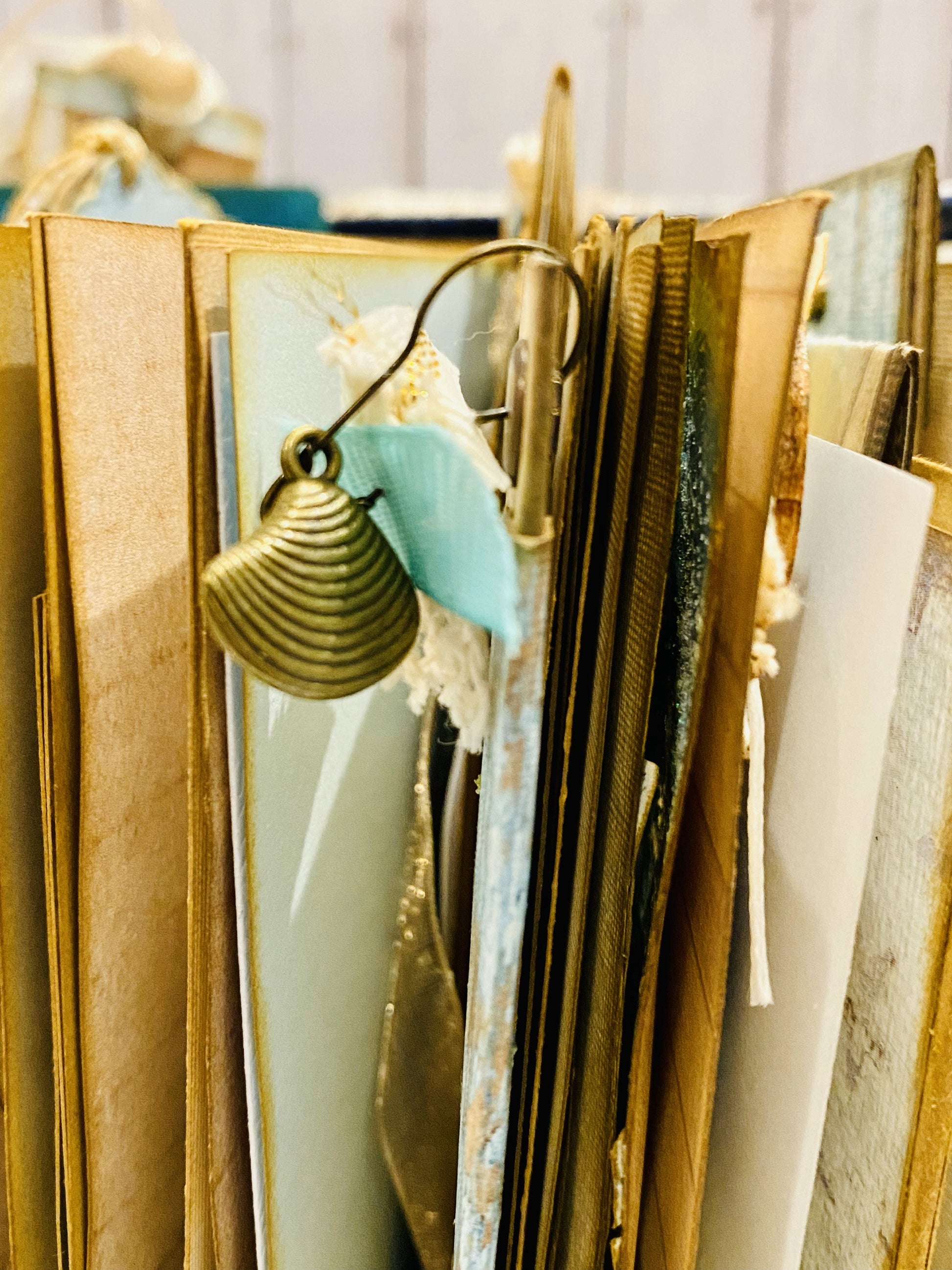 Salacia: This lovely handmade, maximalist vintage-style journal was crafted with care and love. It is inspired by "Salacia," the goddess of the sea. The journal features four sewn signatures (groups of pages), a sturdy hardcover, plenty of space for journaling, a beautiful custom tassel, and numerous pockets filled with delightful items such as tags, mini notebooks, bookmarks, cards, custom pages, and more.