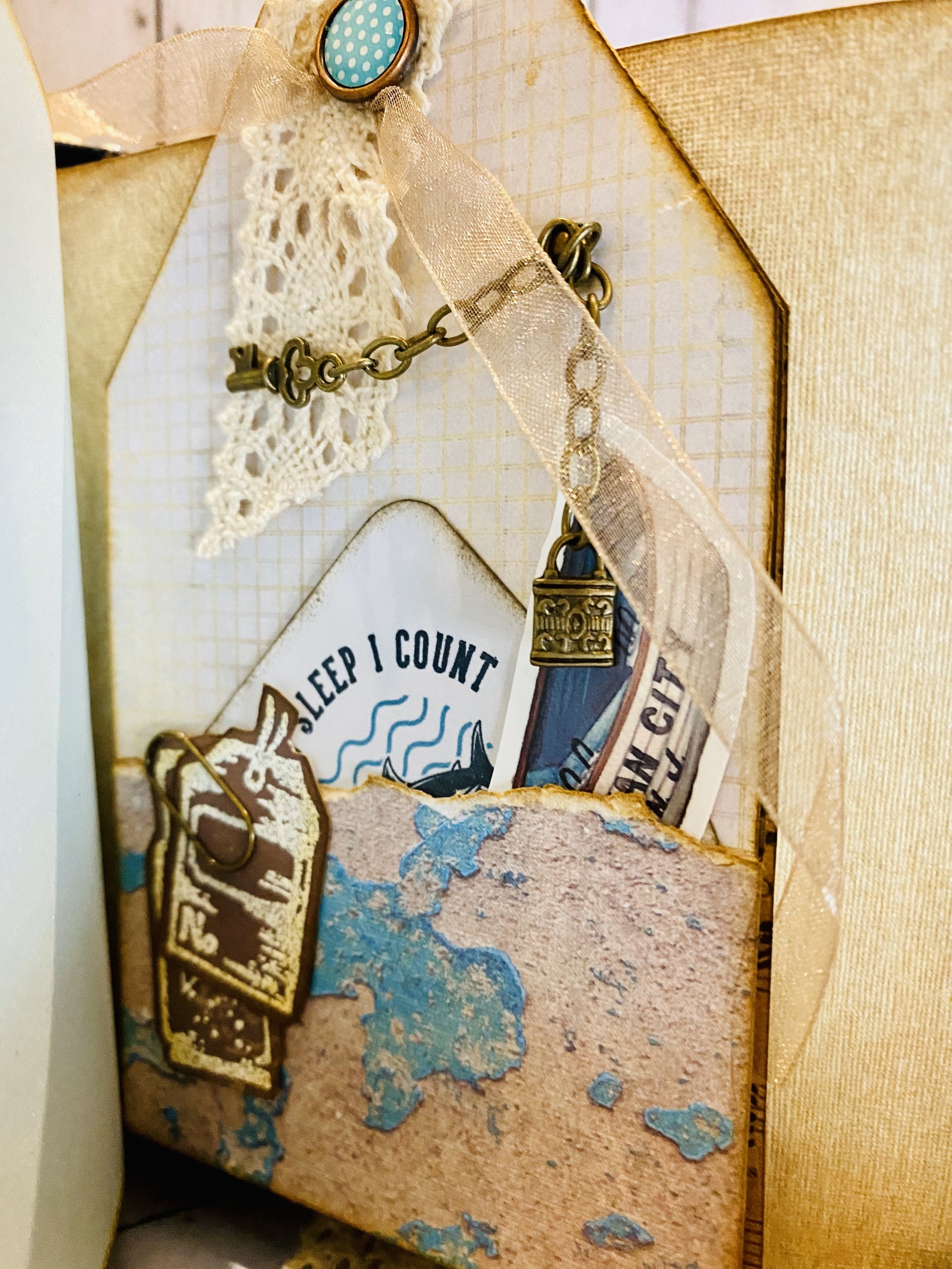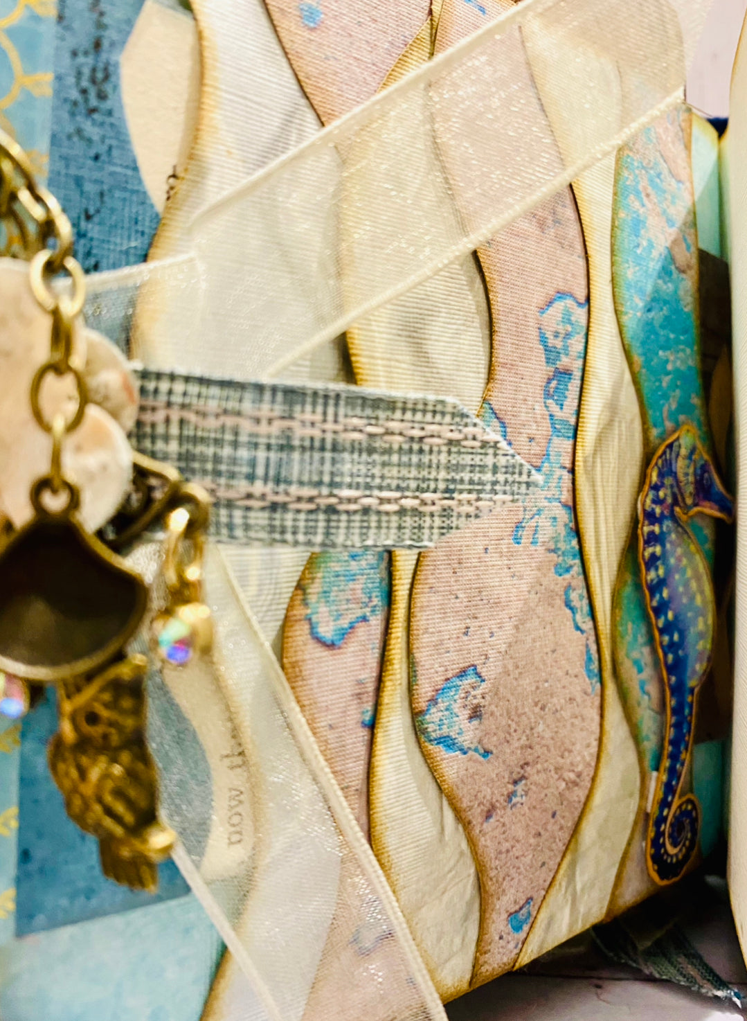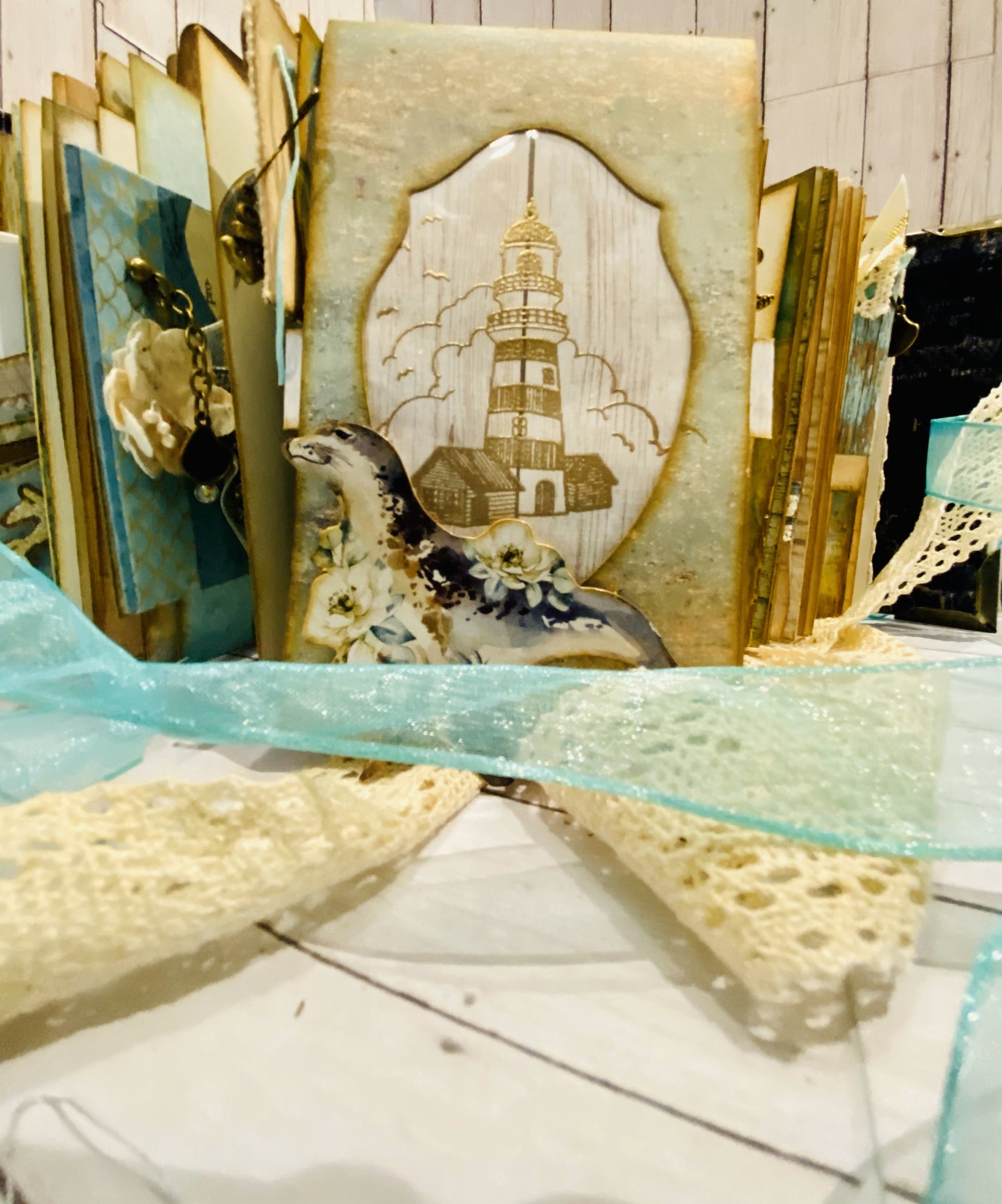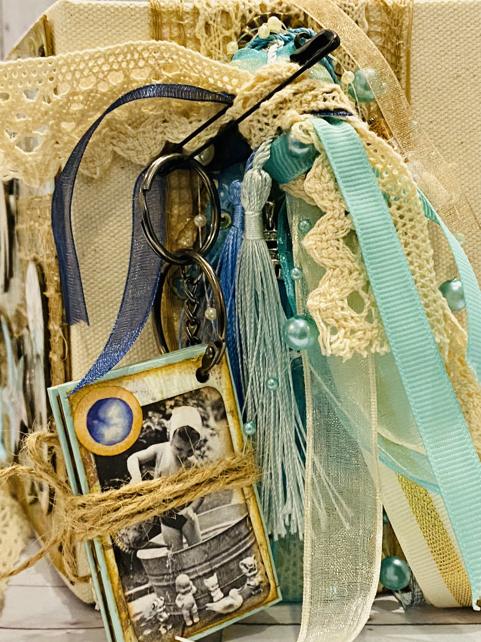 Salacia: This lovely handmade, maximalist vintage-style journal was crafted with care and love. It is inspired by "Salacia," the goddess of the sea. The journal features four sewn signatures (groups of pages), a sturdy hardcover, plenty of space for journaling, a beautiful custom tassel, and numerous pockets filled with delightful items such as tags, mini notebooks, bookmarks, cards, custom pages, and more.