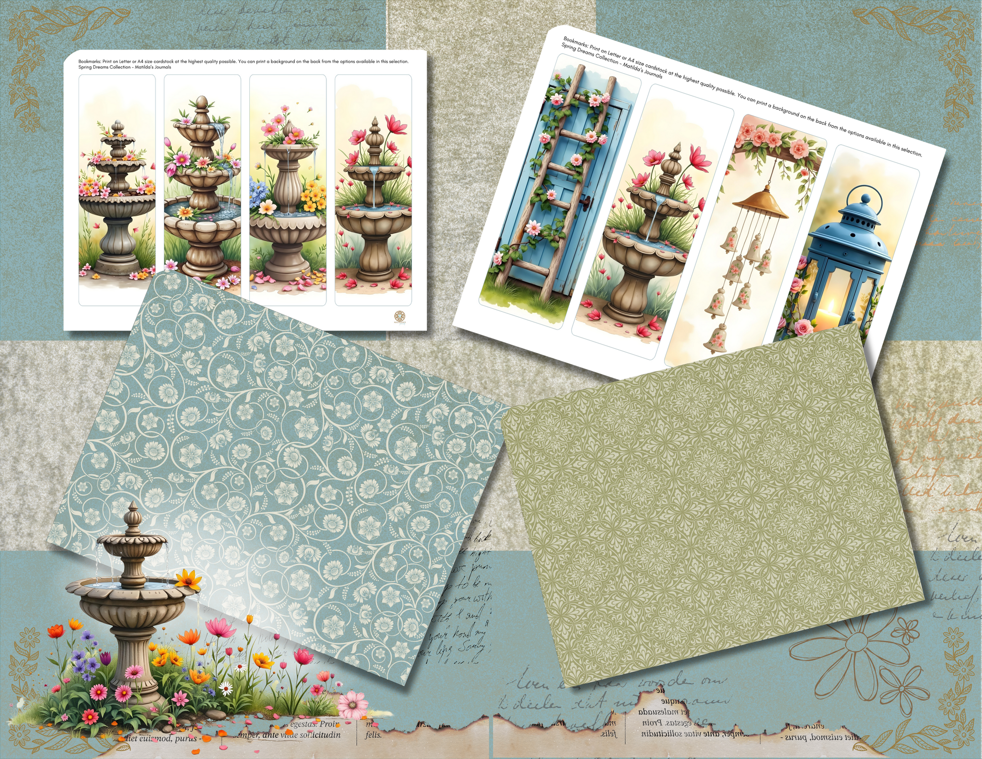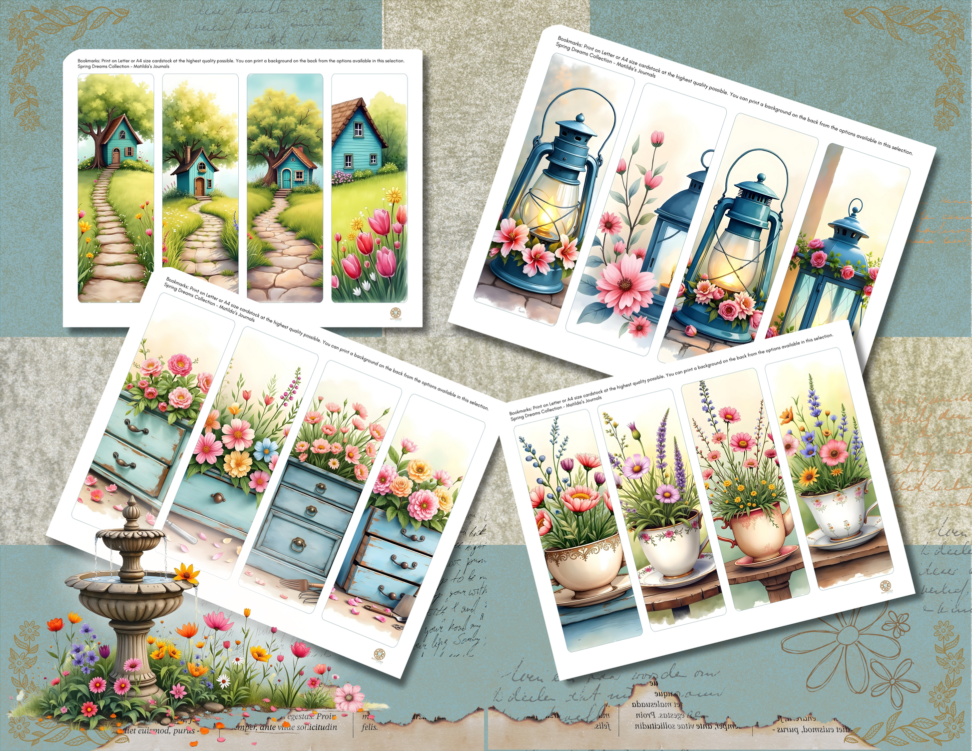 - Design Variety: Featuring enchanting spring-themed illustrations such as blooming flowers, vintage pots, and whimsical fountains.