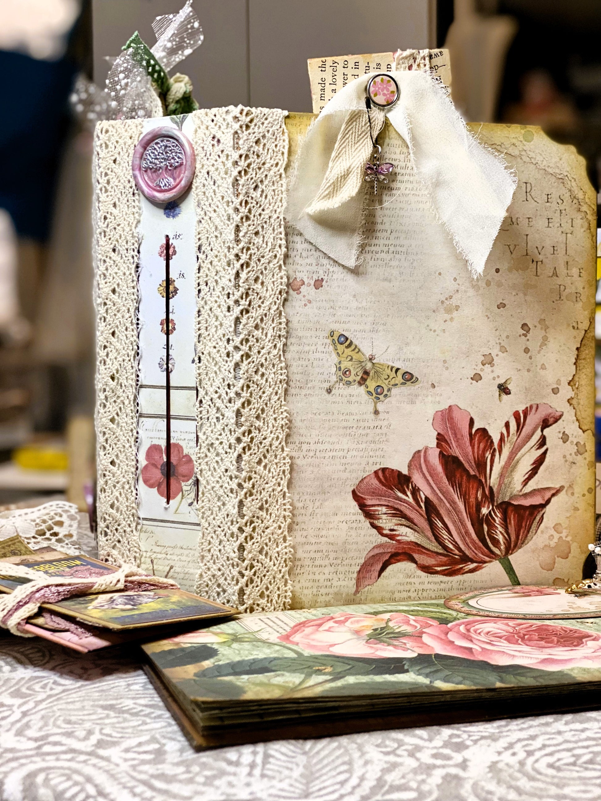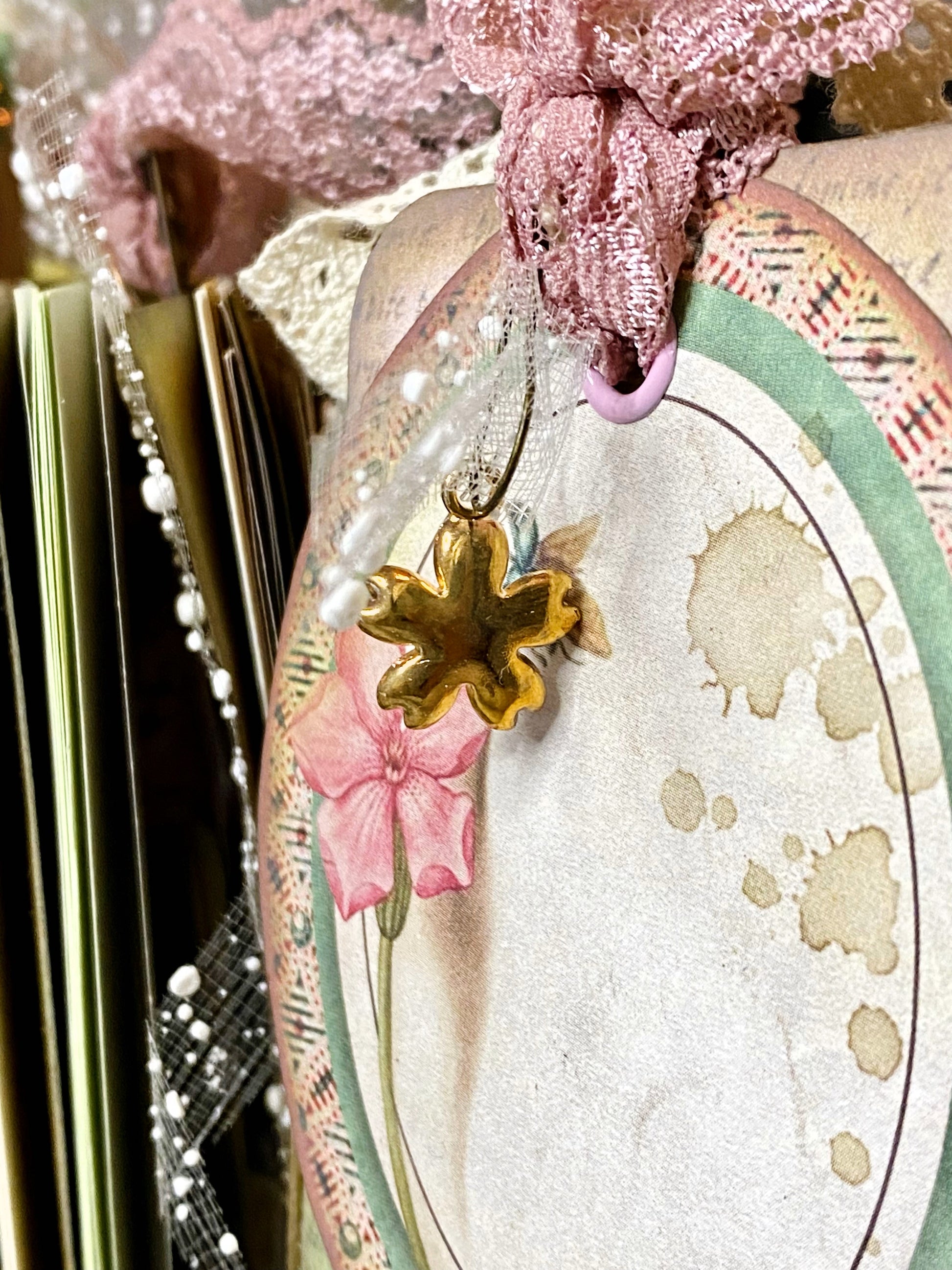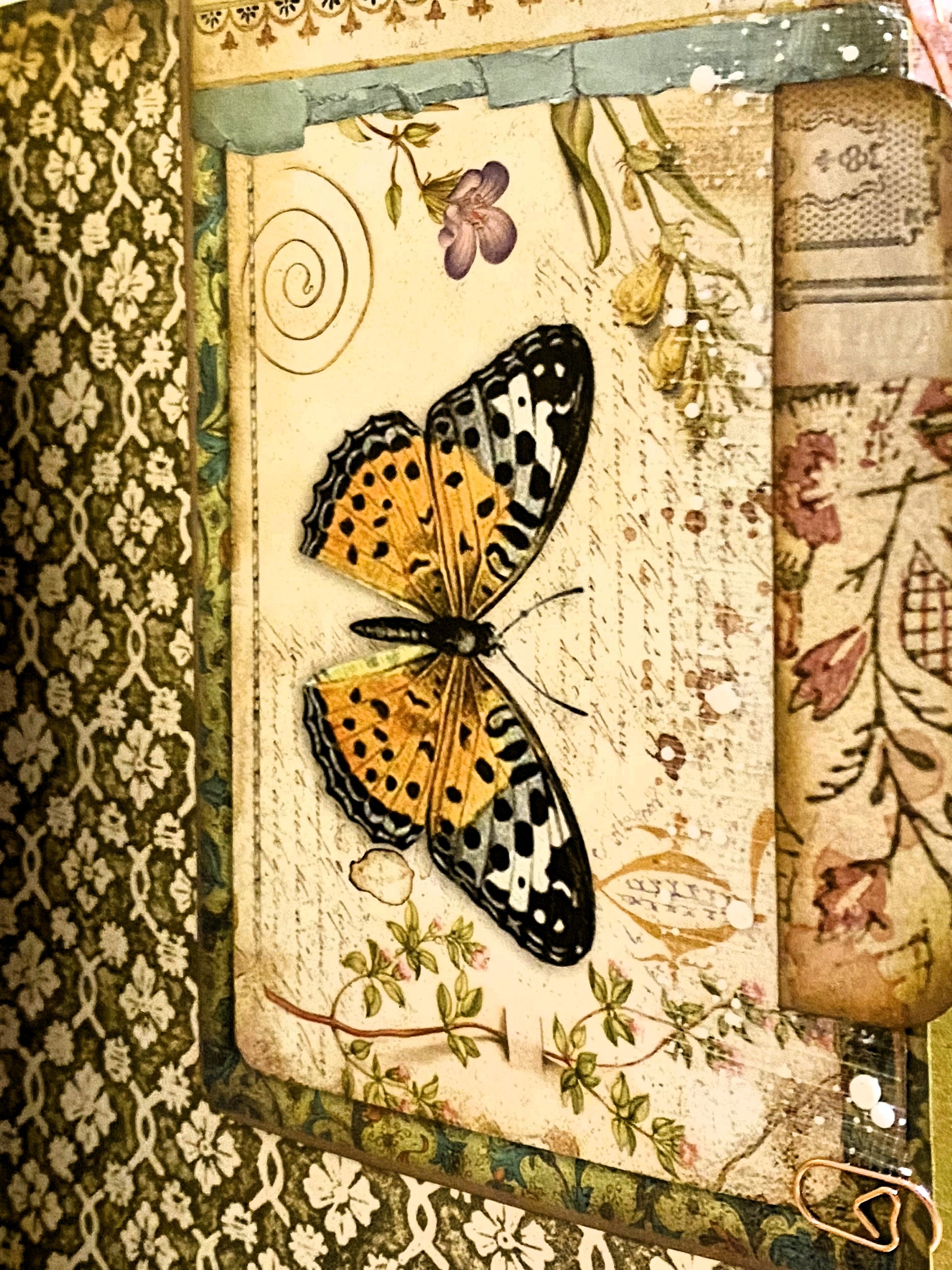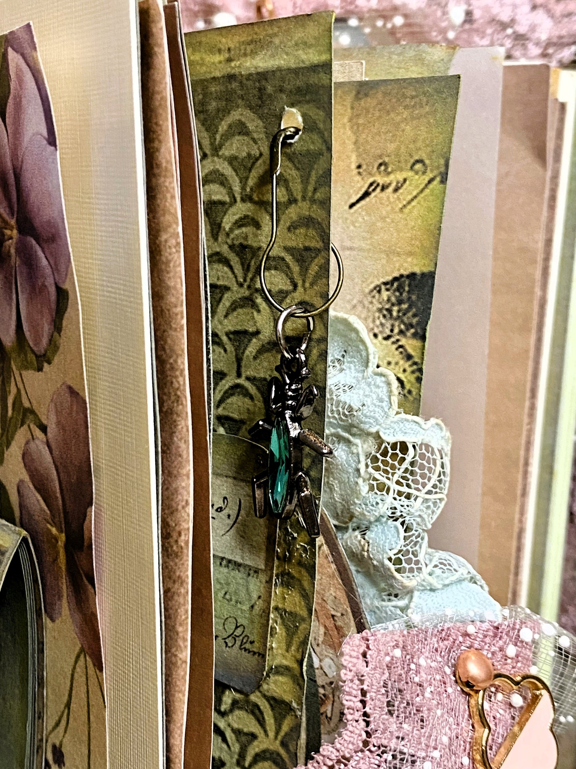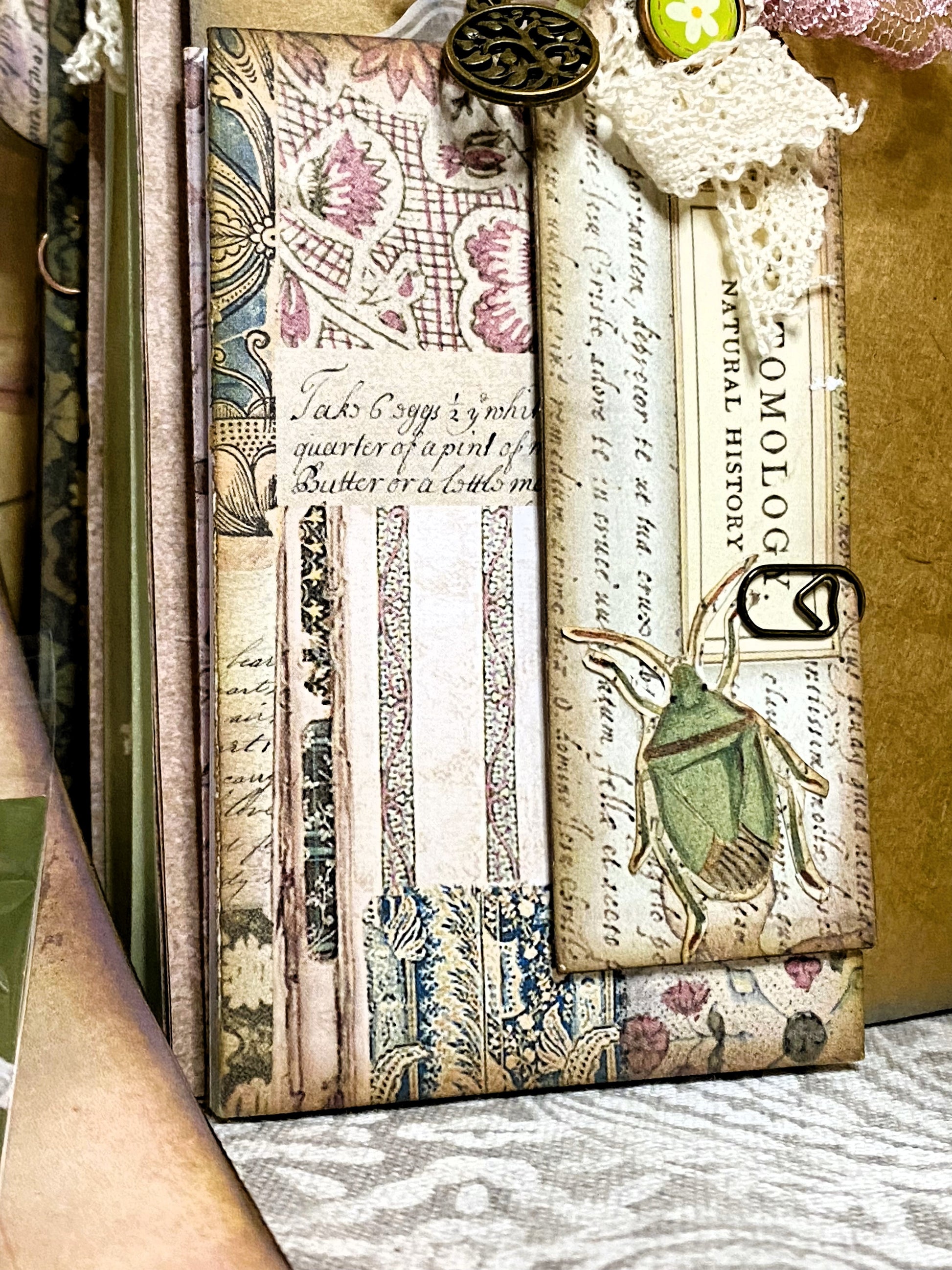 Spring Forest: This lovely handmade, vintage country-style journal was crafted with care and love. It features three hidden sewn signatures (groups of pages), providing plenty of space for journaling. Inside, you’ll find numerous pockets filled with delightful goodies such as tags, mini notebooks, bookmarks, cards, custom pages, and more. Inspired by the forest, greenery, flowers, and charming little bugs.
