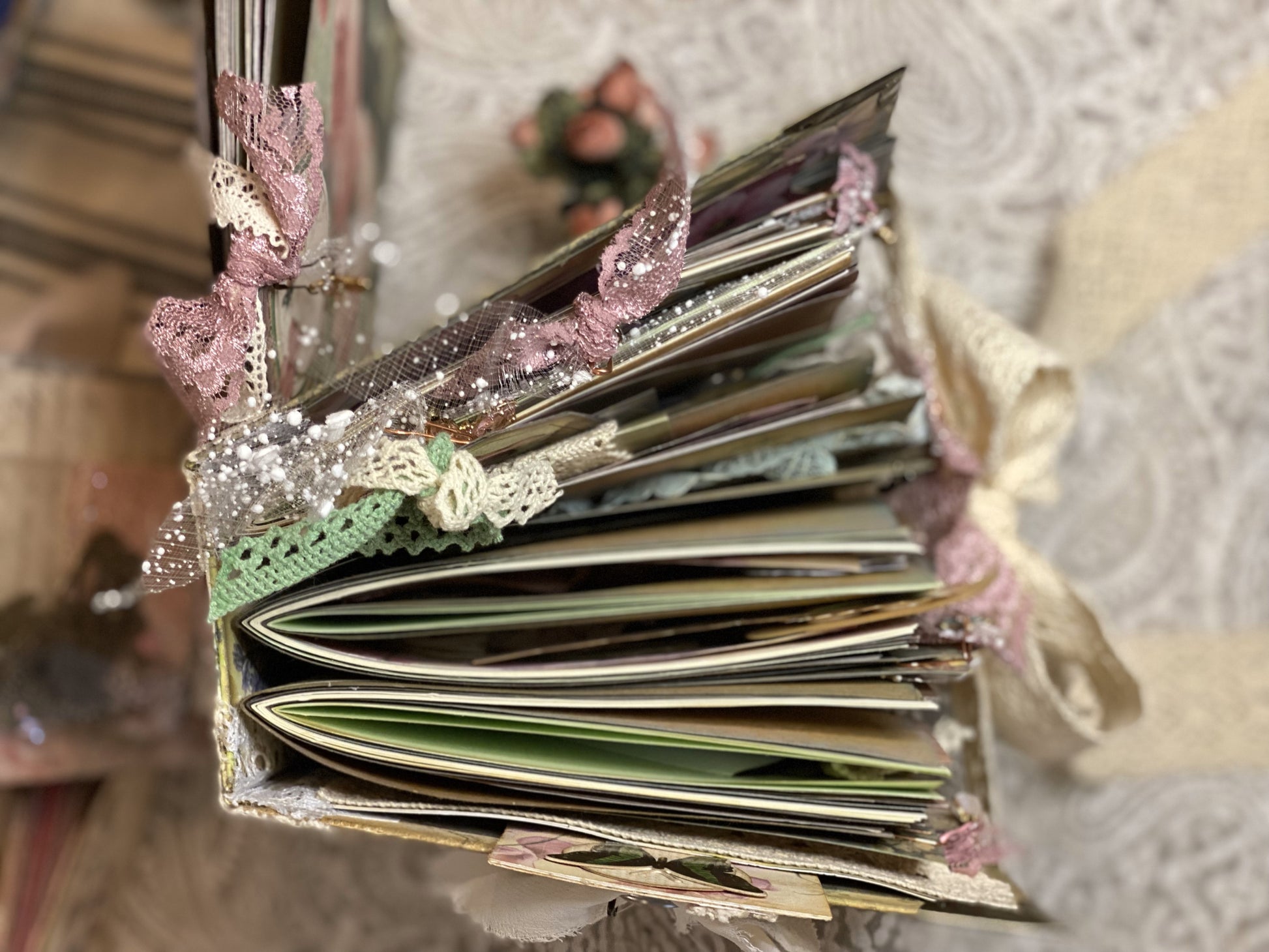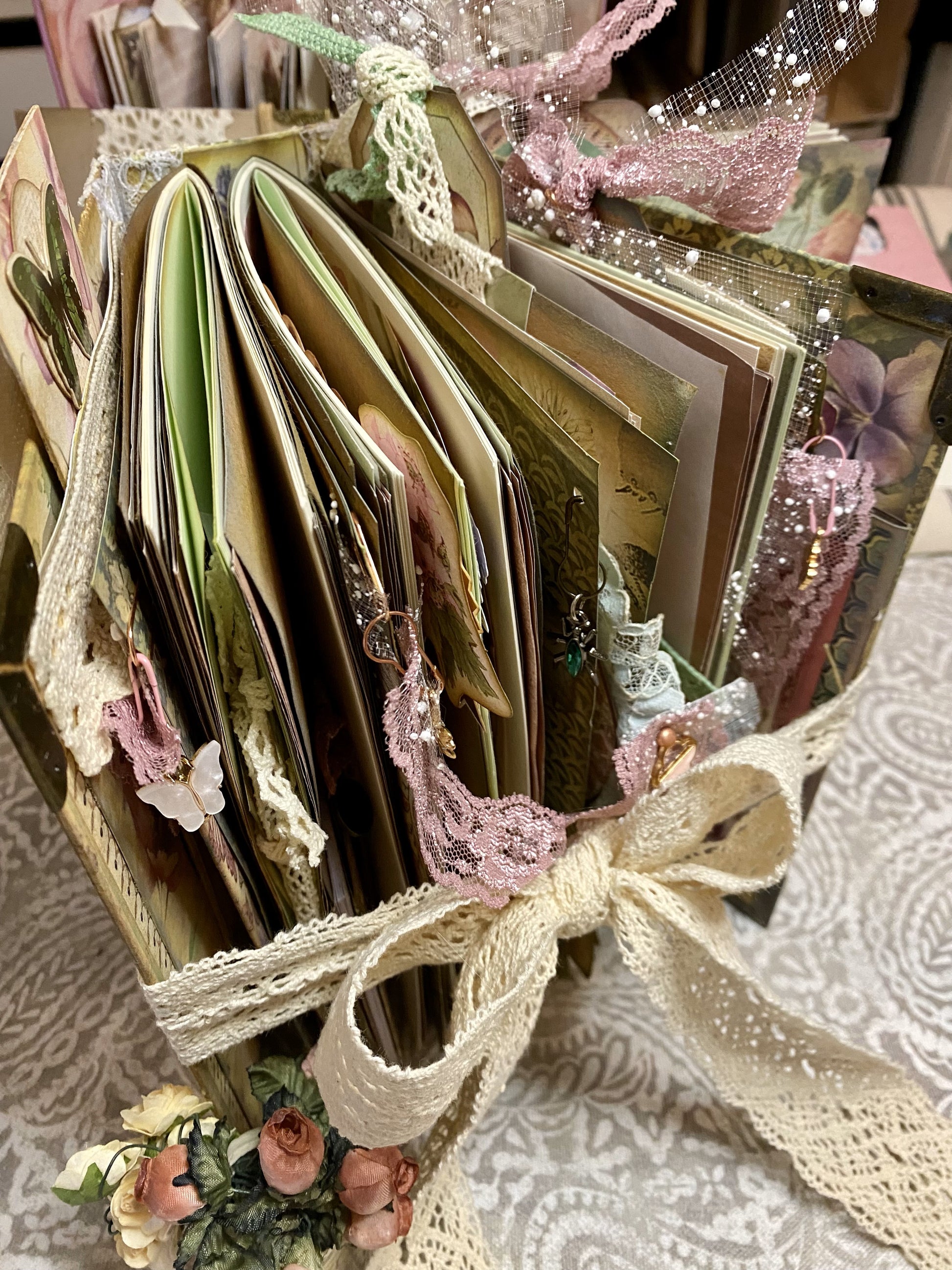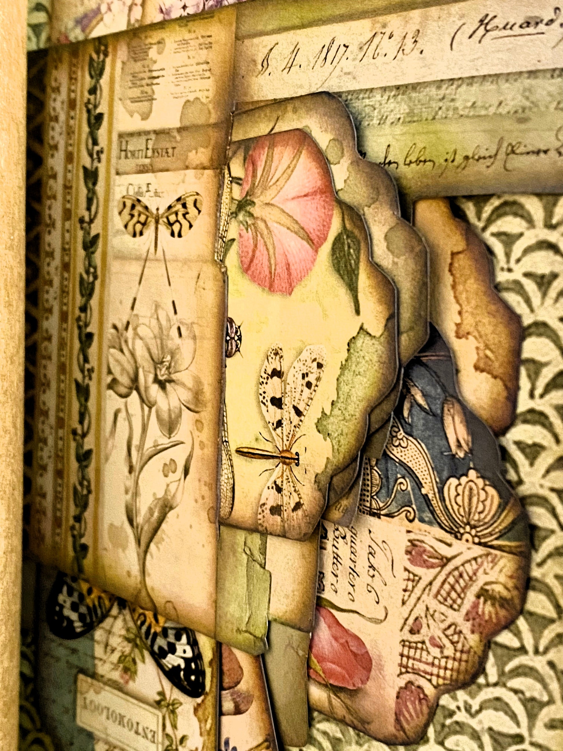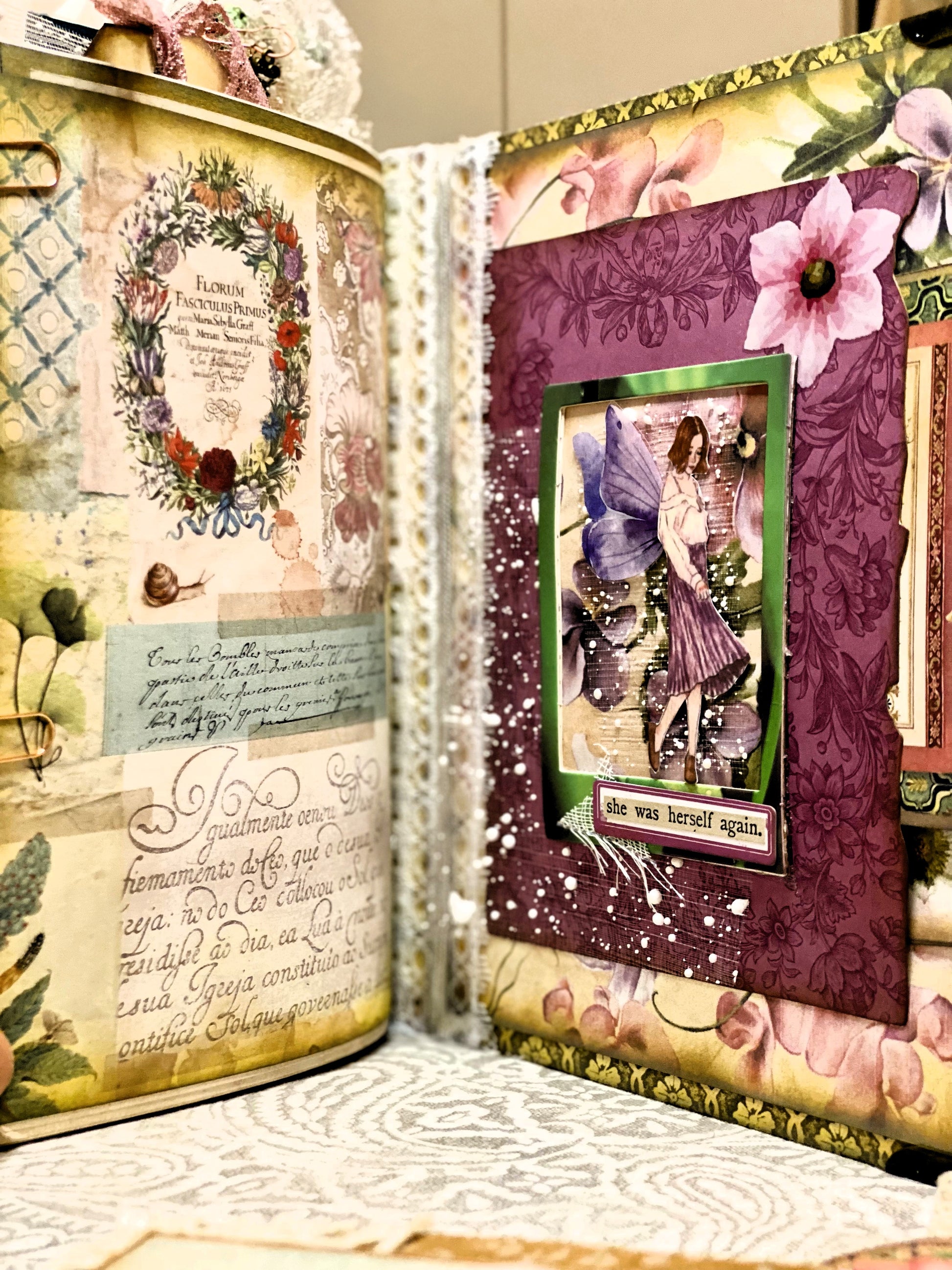 Spring Forest: This lovely handmade, vintage country-style journal was crafted with care and love. It features three hidden sewn signatures (groups of pages), providing plenty of space for journaling. Inside, you’ll find numerous pockets filled with delightful goodies such as tags, mini notebooks, bookmarks, cards, custom pages, and more. Inspired by the forest, greenery, flowers, and charming little bugs.
