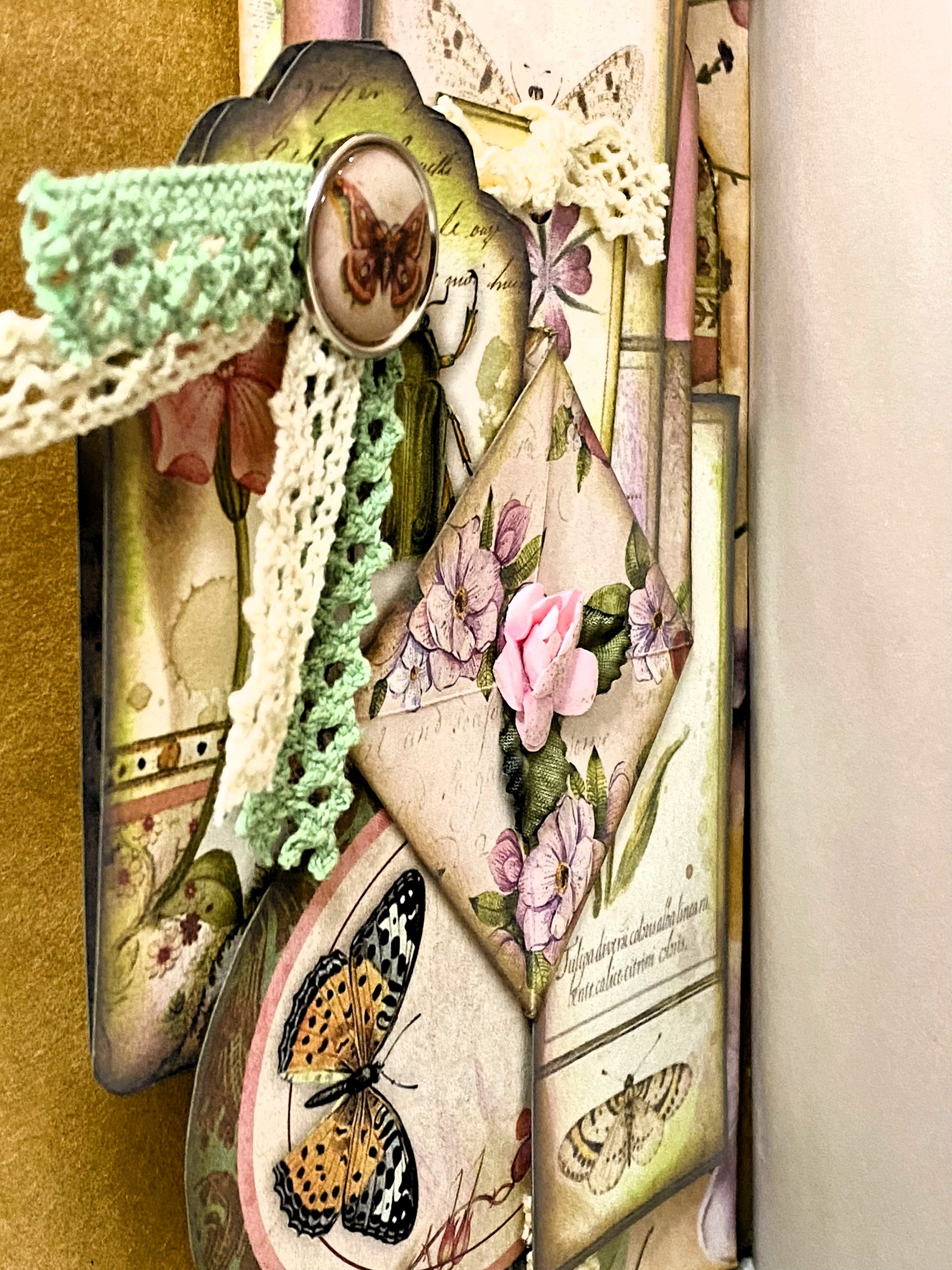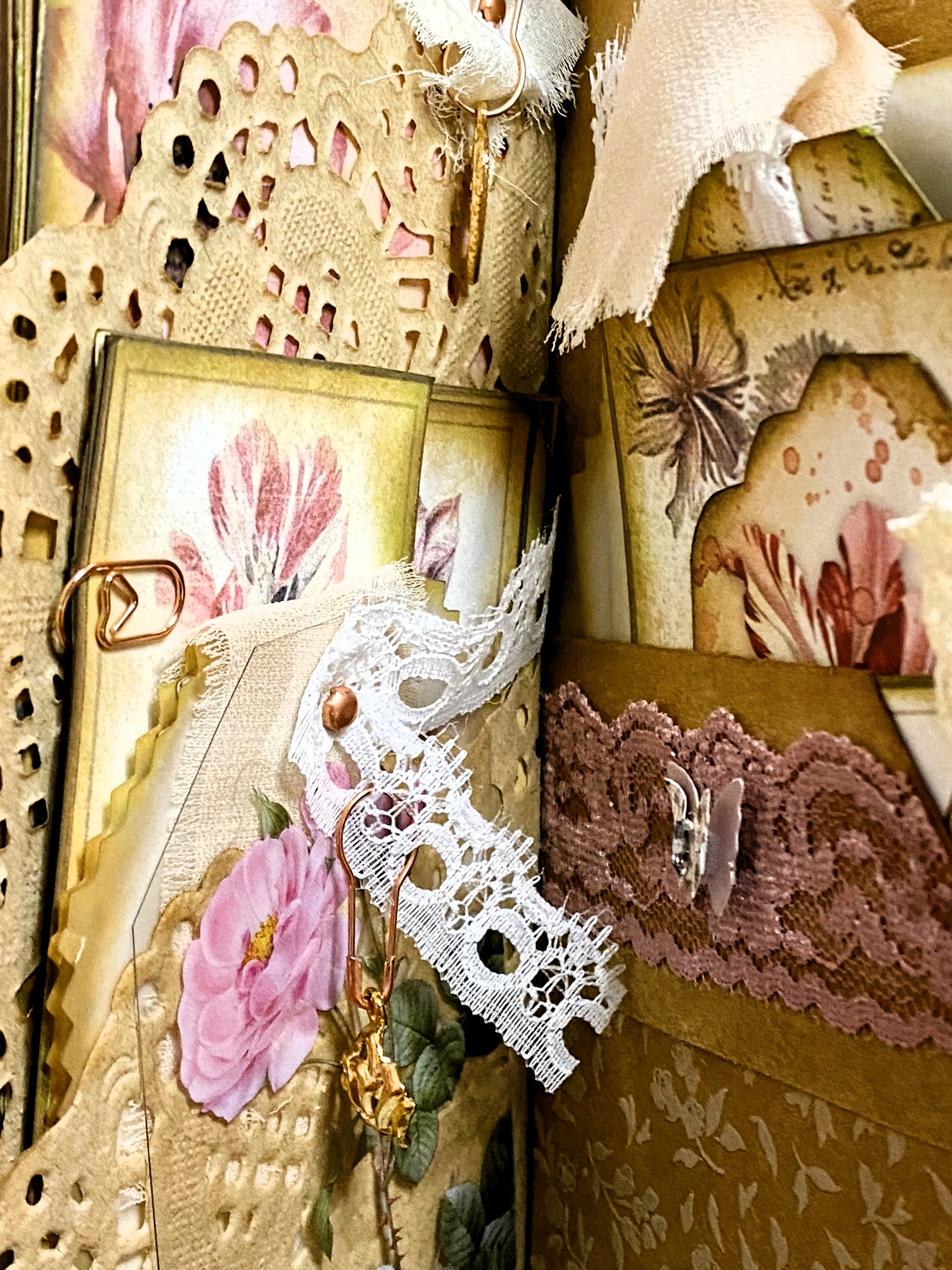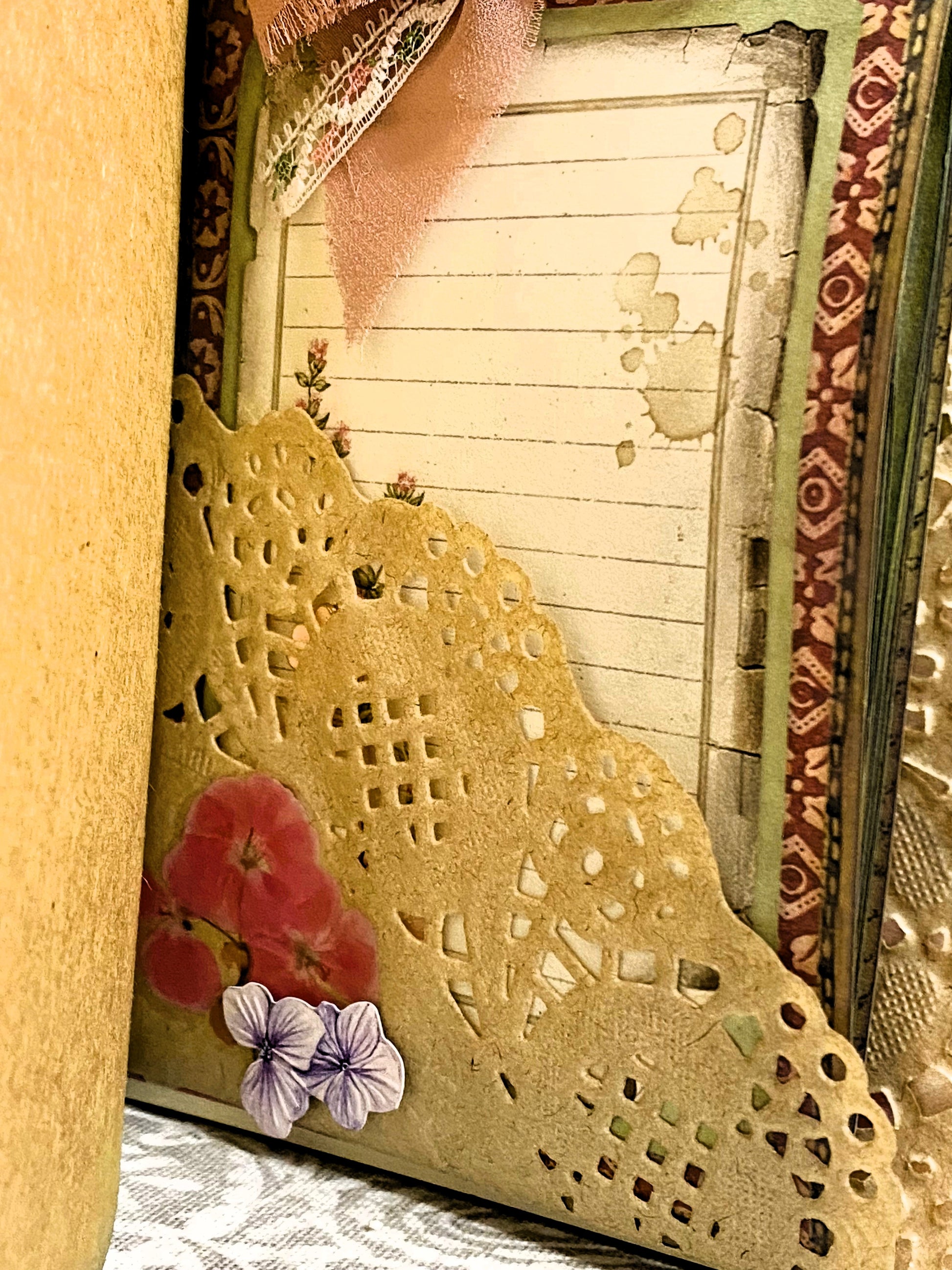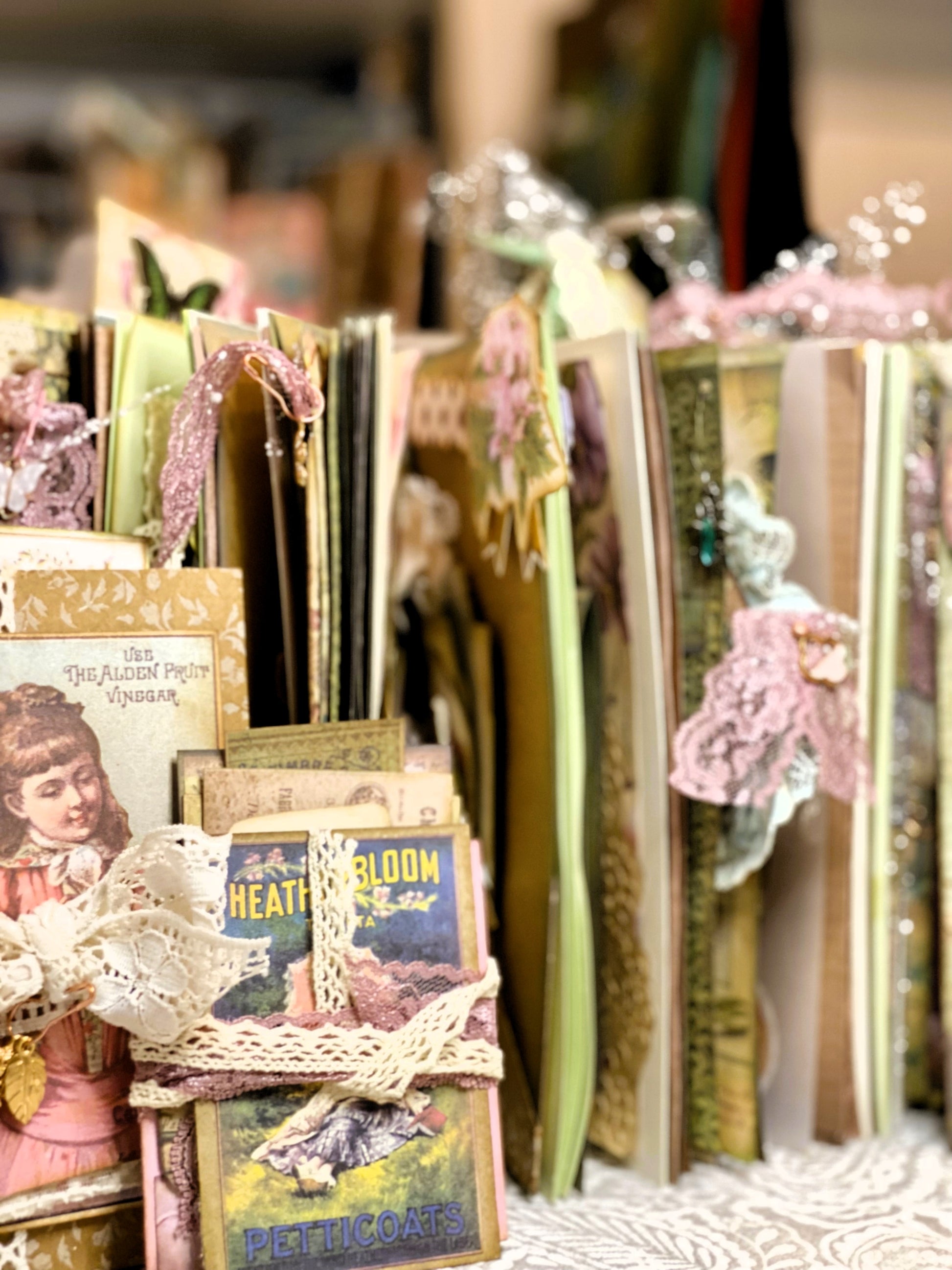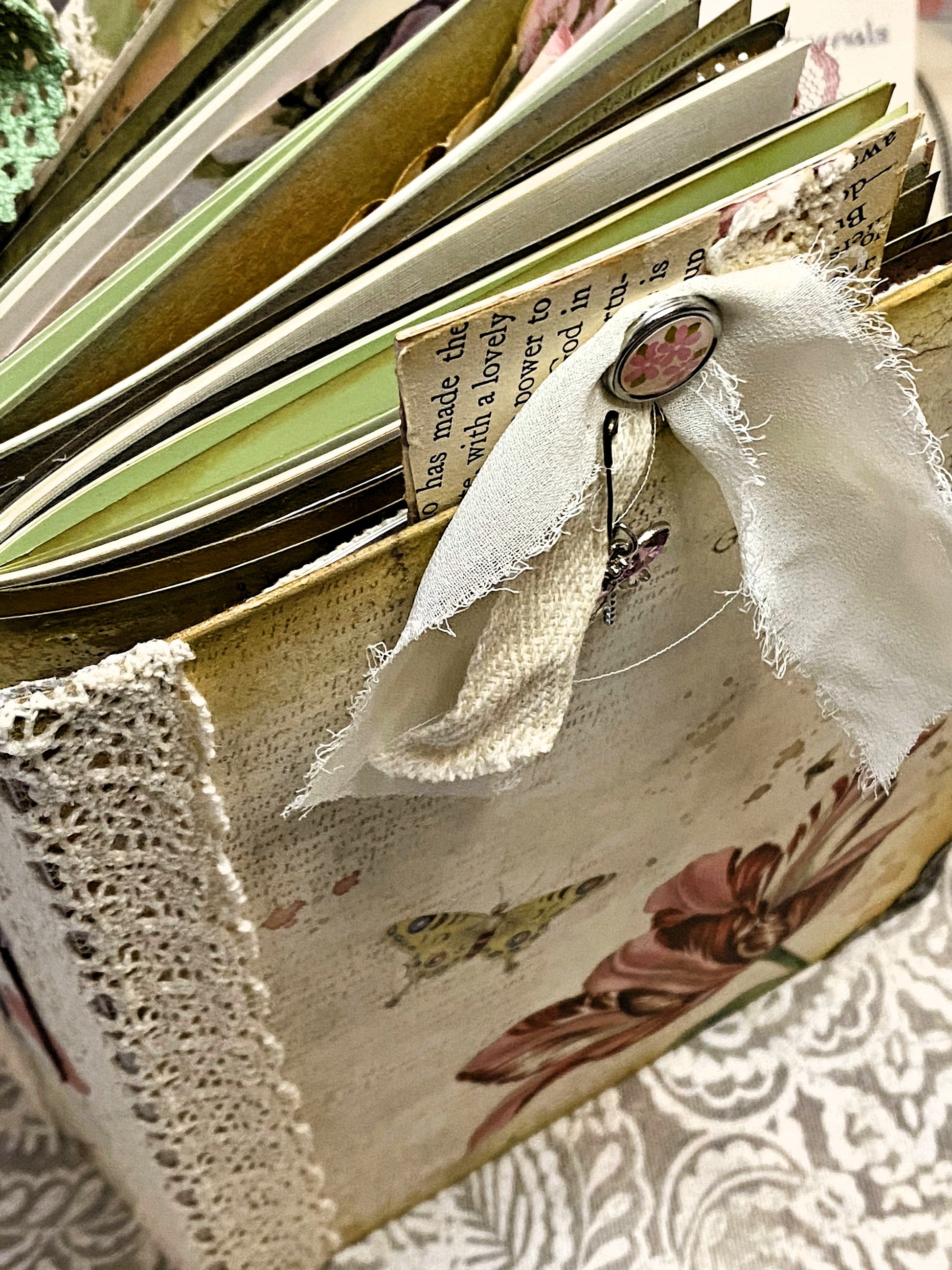 Spring Forest: This lovely handmade, vintage country-style journal was crafted with care and love. It features three hidden sewn signatures (groups of pages), providing plenty of space for journaling. Inside, you’ll find numerous pockets filled with delightful goodies such as tags, mini notebooks, bookmarks, cards, custom pages, and more. Inspired by the forest, greenery, flowers, and charming little bugs.