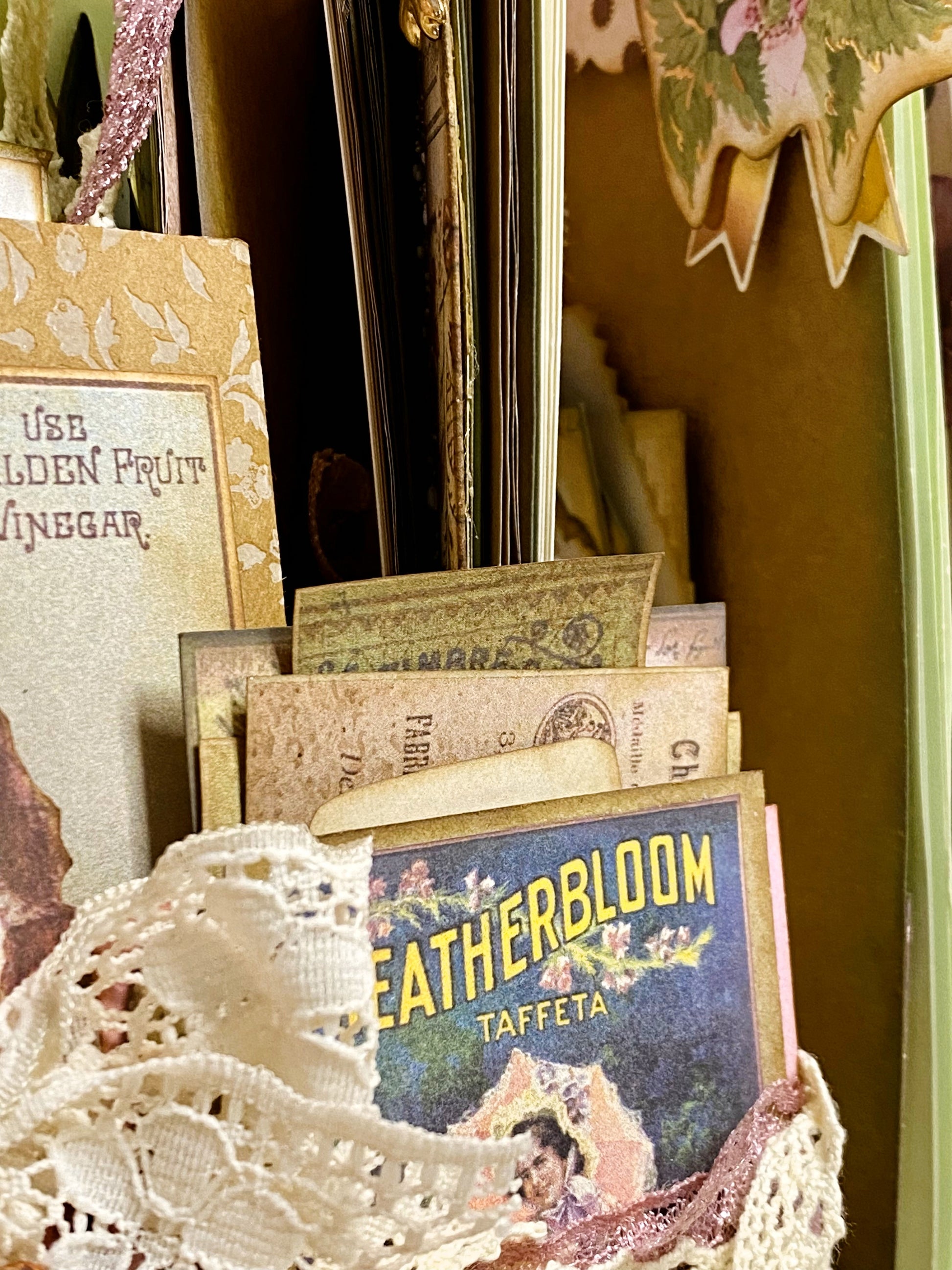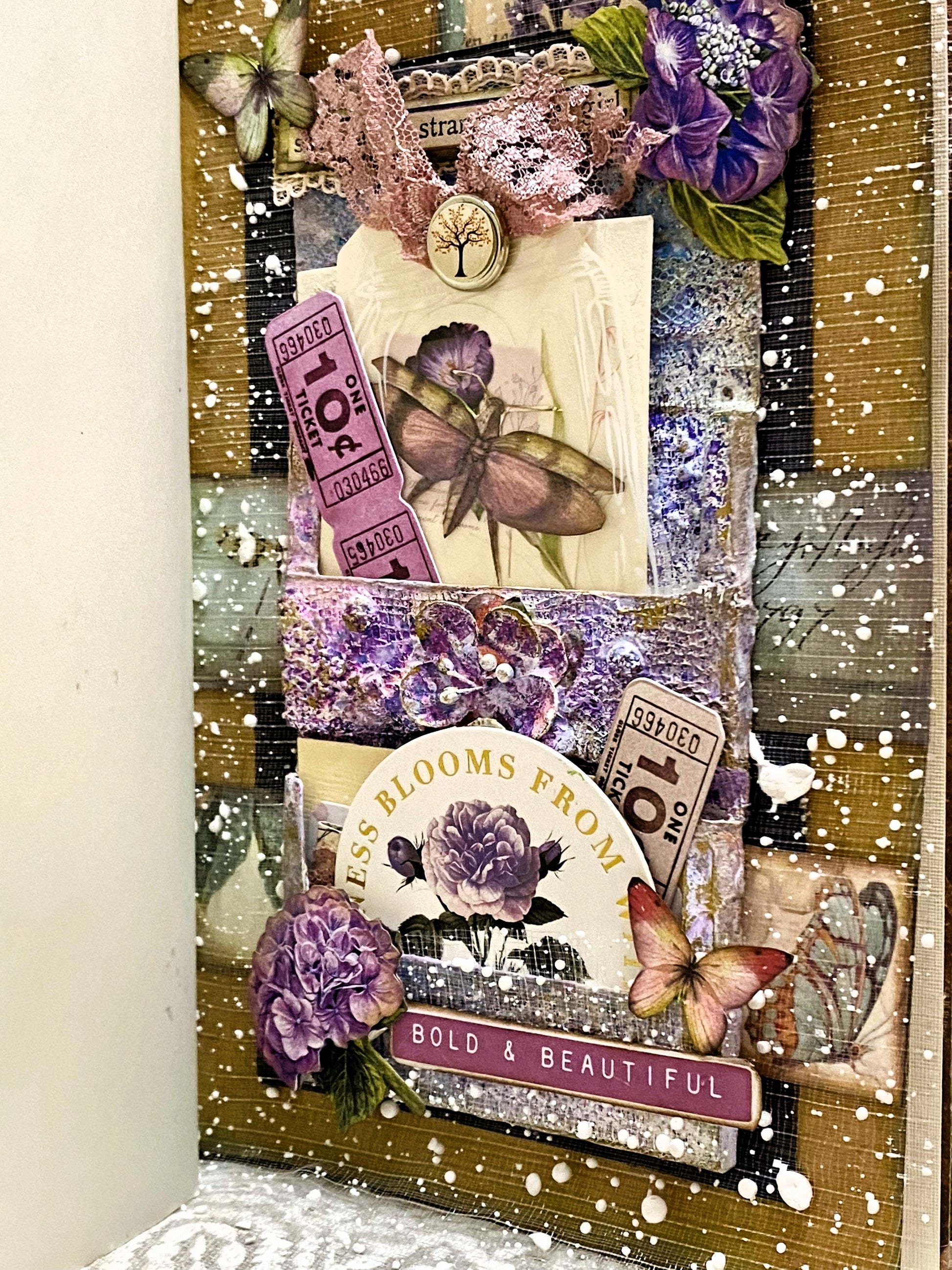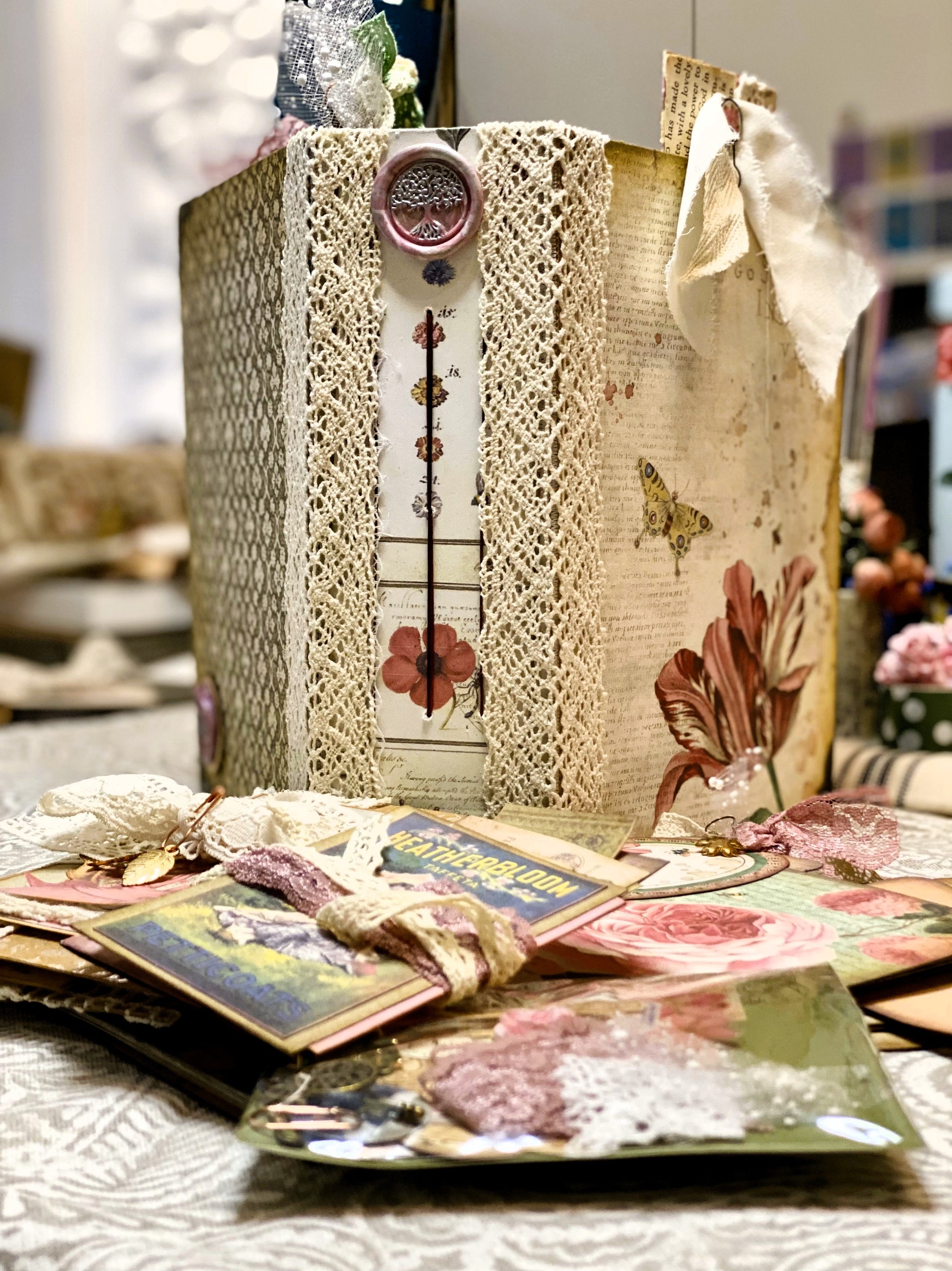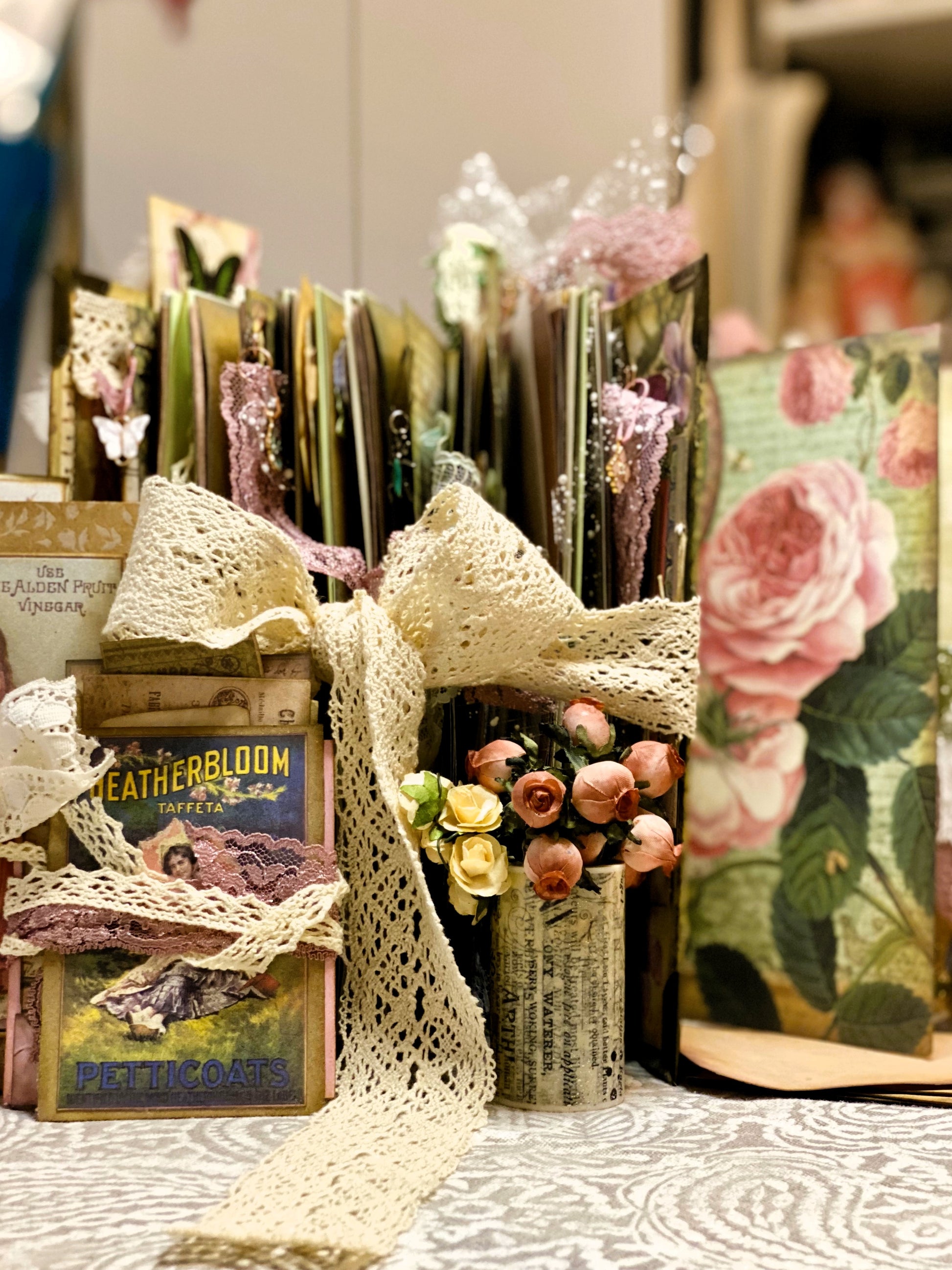 Spring Forest: This lovely handmade, vintage country-style journal was crafted with care and love. It features three hidden sewn signatures (groups of pages), providing plenty of space for journaling. Inside, you’ll find numerous pockets filled with delightful goodies such as tags, mini notebooks, bookmarks, cards, custom pages, and more. Inspired by the forest, greenery, flowers, and charming little bugs.