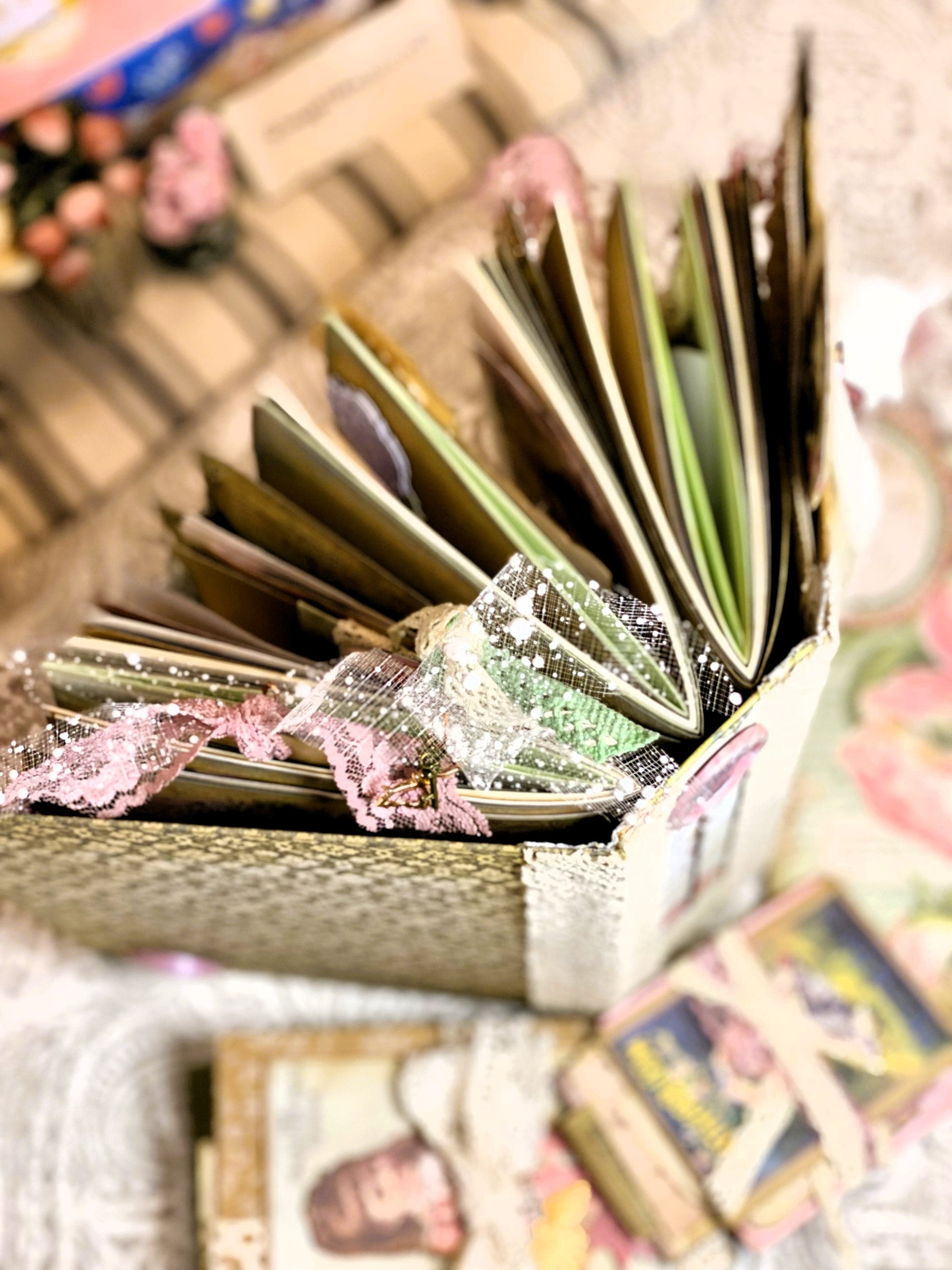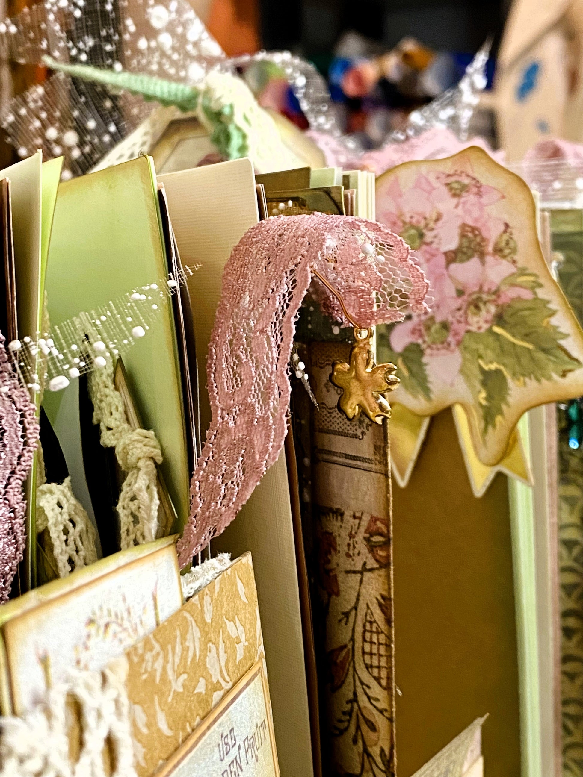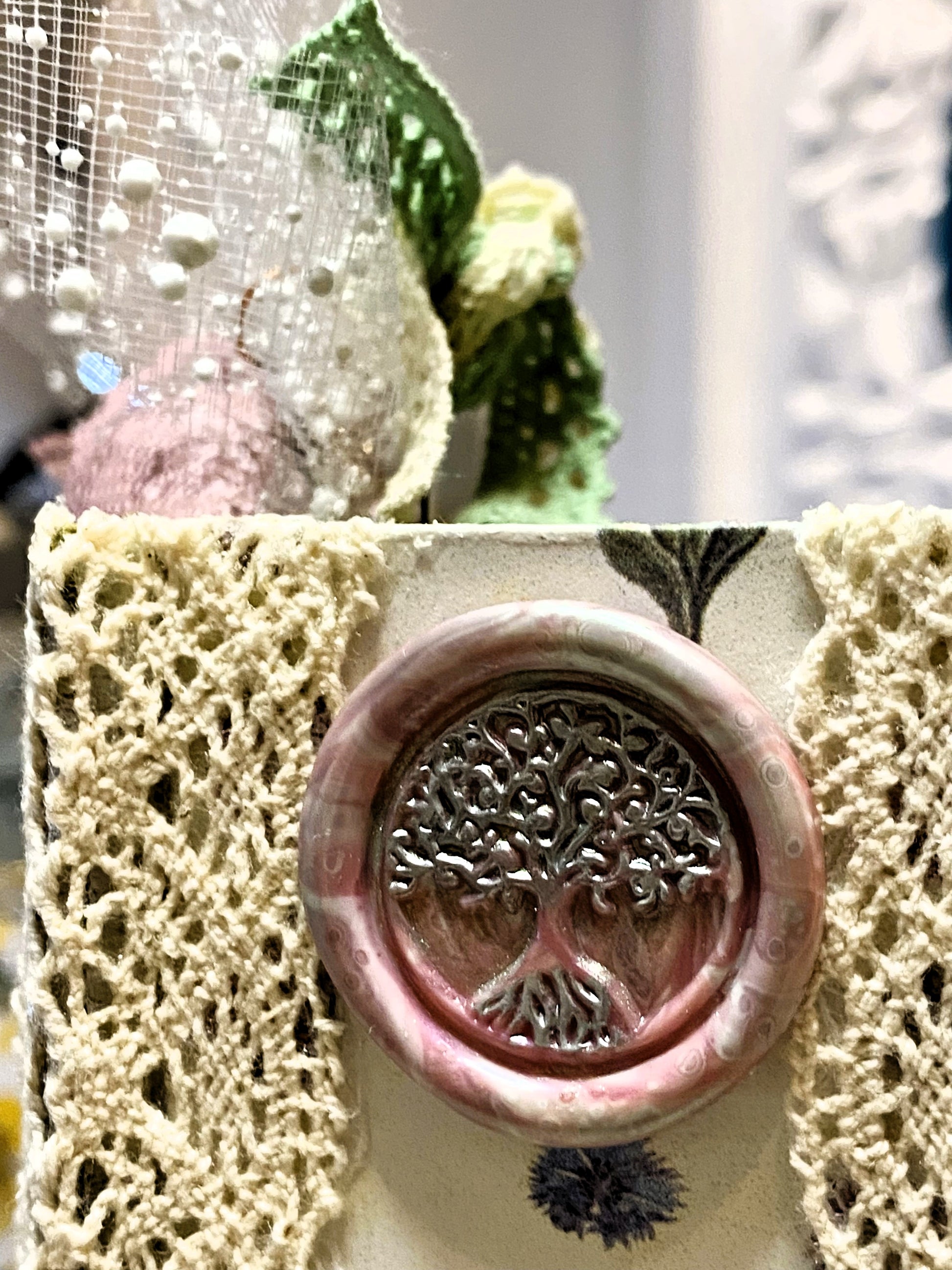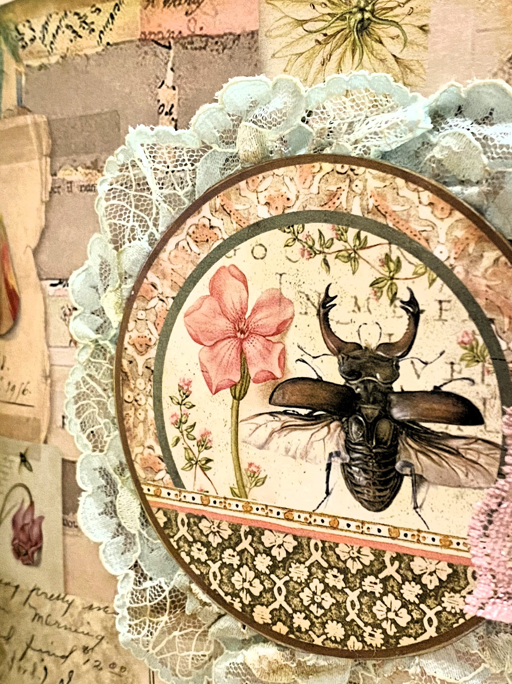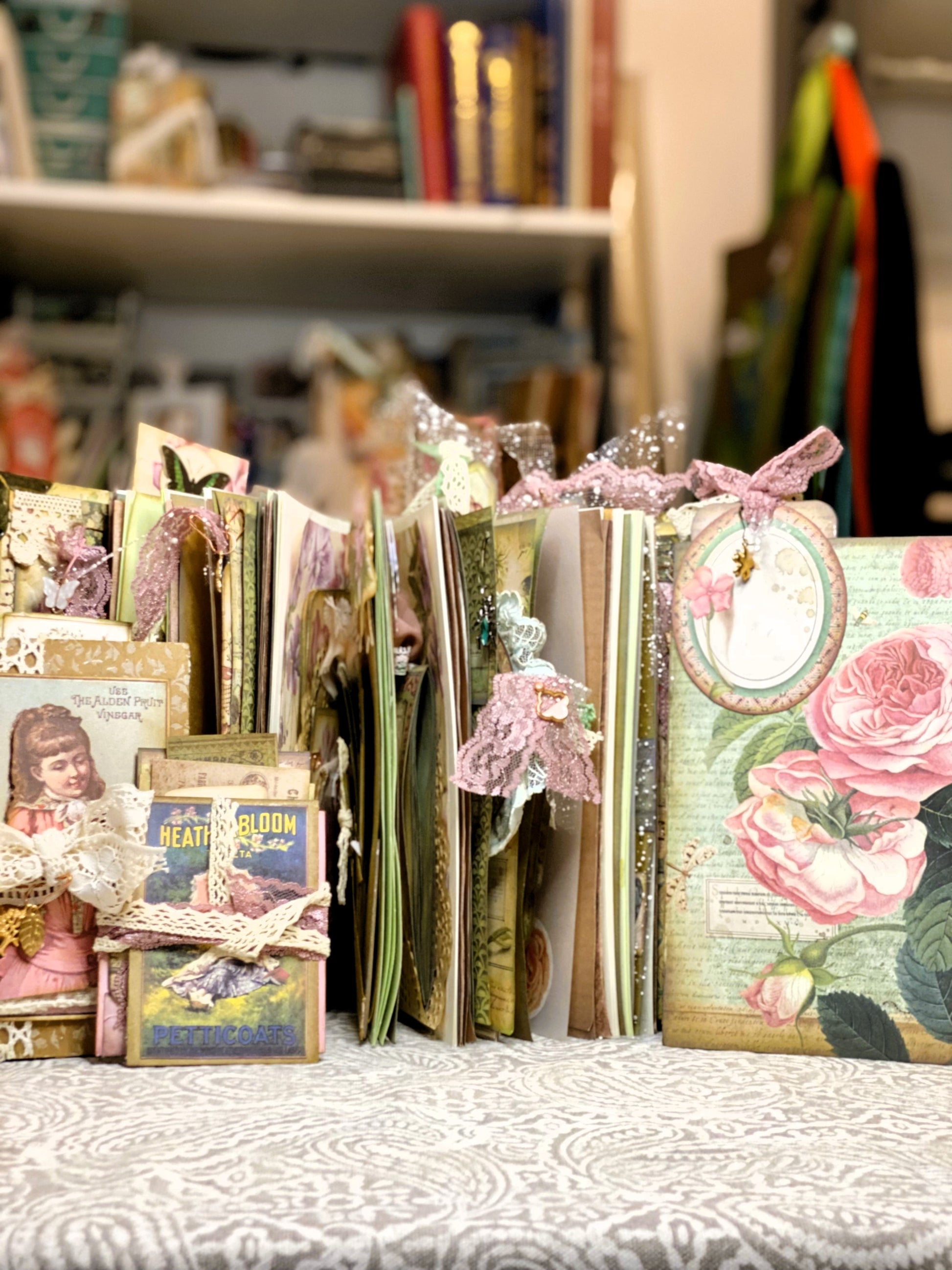 Spring Forest: This lovely handmade, vintage country-style journal was crafted with care and love. It features three hidden sewn signatures (groups of pages), providing plenty of space for journaling. Inside, you’ll find numerous pockets filled with delightful goodies such as tags, mini notebooks, bookmarks, cards, custom pages, and more. Inspired by the forest, greenery, flowers, and charming little bugs.