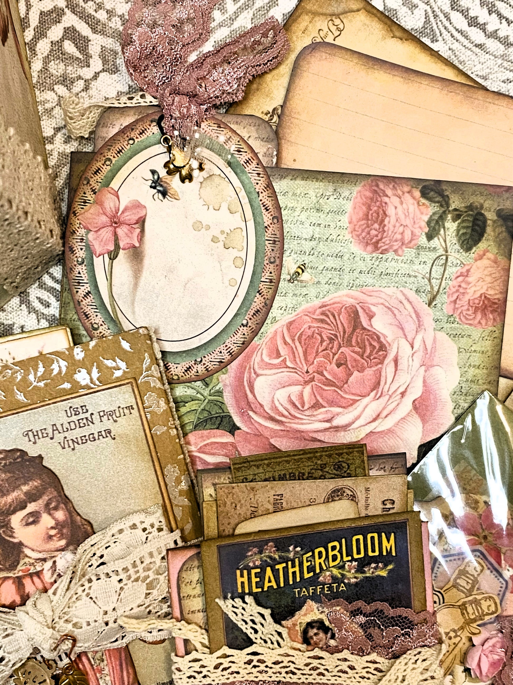 All my journals come with a large envelope filled with ephemera, stickers, paper scraps, washi tape, lace, and a variety of miscellaneous materials you’ll love to start creating with right away.